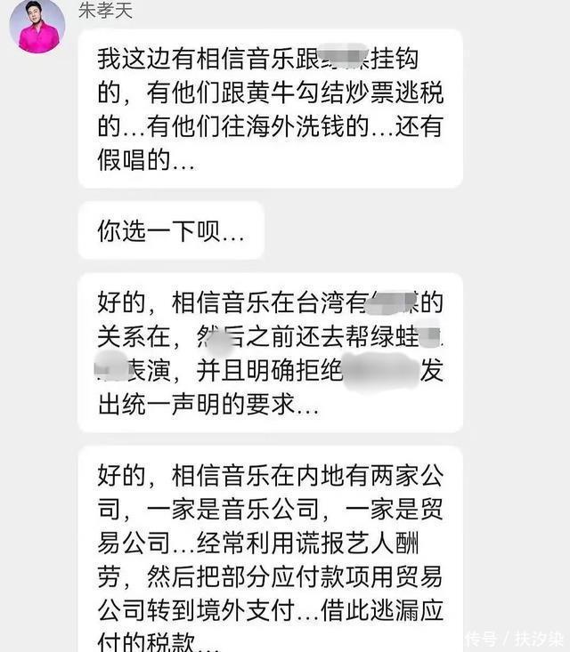 除了逃掉税款问题, 朱孝天还声称自己掌握了相信音乐与非法势力挂钩的信息,以及往海外洗钱的问题 。他表示相信音乐有帮某势力站台表演,还明确拒绝了相关部门发出的统一声明要求。而海外洗钱的方式主要是透过相信音乐在内地的两家公司,一家是音乐公司,一家是贸易公司,经常利用谎报艺人酬劳的形式,把部分应付款项用贸易公司转移到境外,借此逃税。